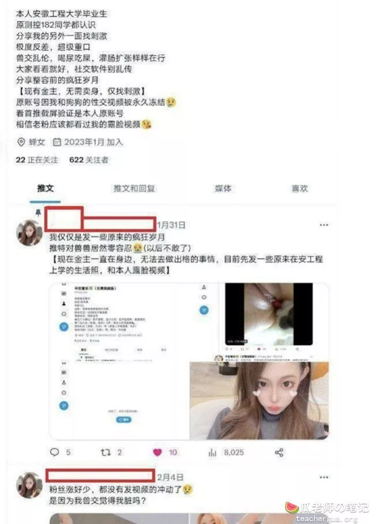 郑天薇之前在推特上发布她和家中狗狗的CaoB视频,结果账号被封禁了。于是新起了一个号,自爆爱重口爱兽交,还发表推文说推特对兽兽 0 容忍。目前也被金主包养,不方便与狗狗做出一些出格的事情,结果被吃瓜群众认出她是来自安徽工程大学的机械汽车工程学院的,这下直接社死。其做i视频等也被扒了出来