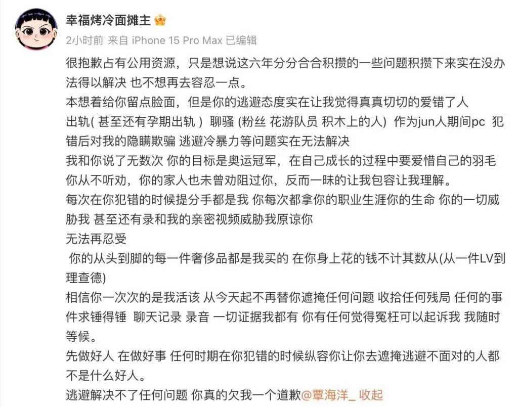 中国游泳队的成员,泳将覃海洋因出轨、嫖娼、与未婚妻的争议爆料而成为焦点。作为一名军人和游泳运动员,覃海洋不仅卷入了与多名对象的绯闻,还被指控在未婚妻怀孕期间出轨,涉及的对象包括粉丝、花样游泳运动员等。此外,分手后他甚至利用私密视频进行威胁。未婚妻,这位幸福烤冷面摊主,通过微博揭露了有关覃海洋的真相,令事件进一步发酵。
