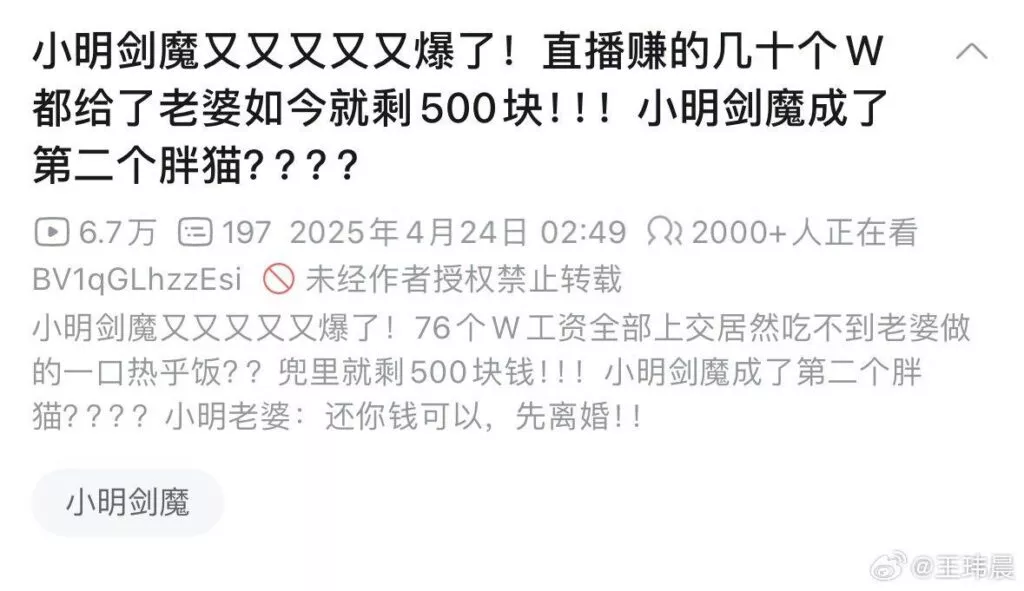 英雄联盟顶级主播“小明的剑魔v”,在游戏直播类型中也是前排的头部主播之一,其个人生活也被称作是天作之合,没想到在昨日的直播中,竟然爆料自己长期被妻子高压统治,直播赚得76万工资全部被妻子抢走,话还未说完,就被妻子强行关闭了直播间。