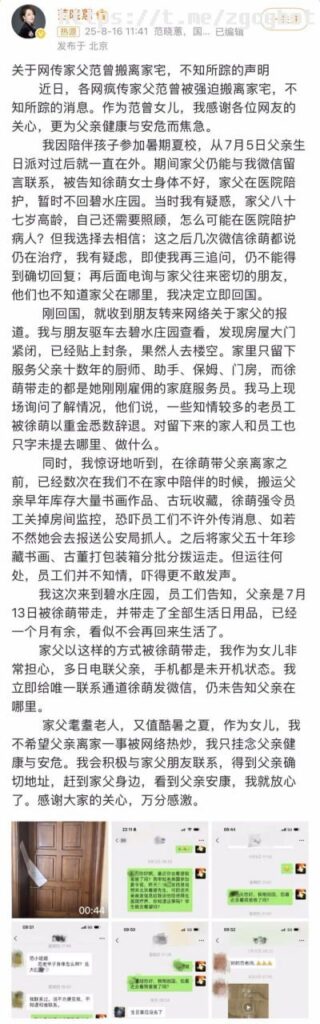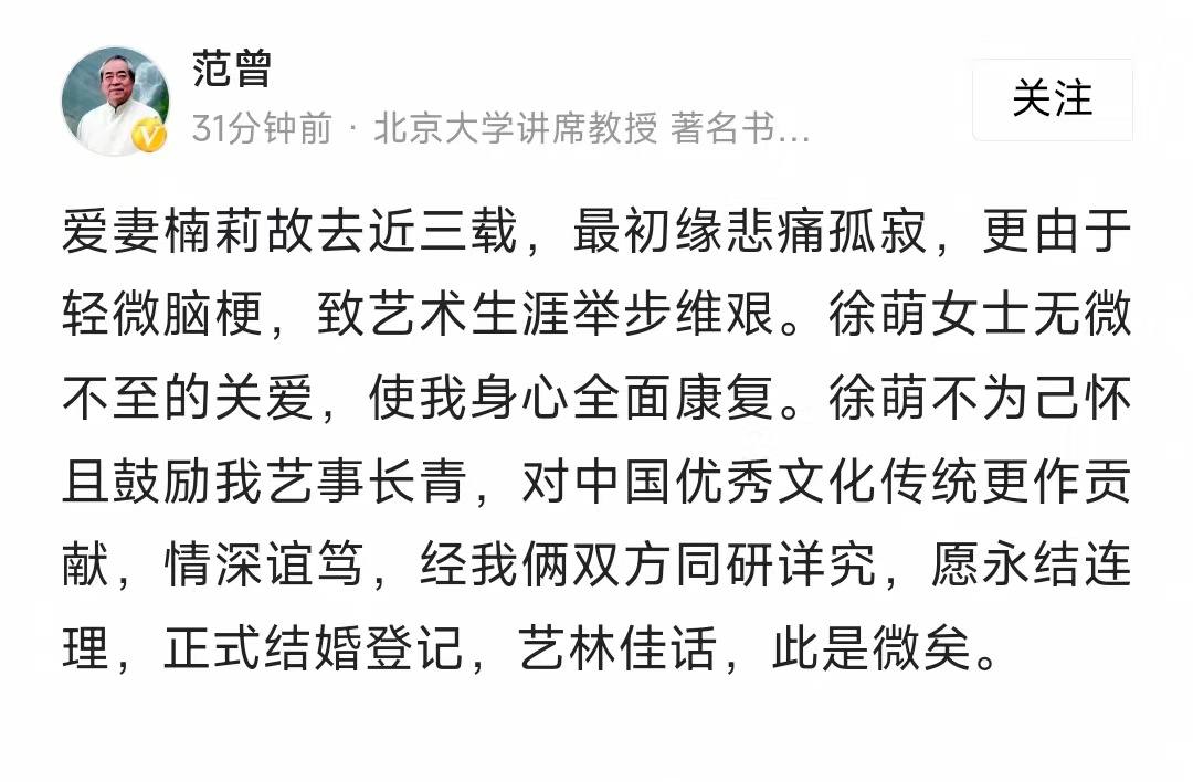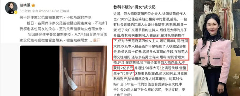 近日有媒体和网络传闻称,著名书画家范曾的比其小约50岁的妻子徐萌涉嫌与多名男子有不正当关系,并被指控与他人合谋转移范曾名下全部书画与藏品。据称涉案藏品价值高达数十亿元。范曾之女范晓蒽在社交平台发文,直指徐萌私下多次出轨、控制范曾行动并出售家产。