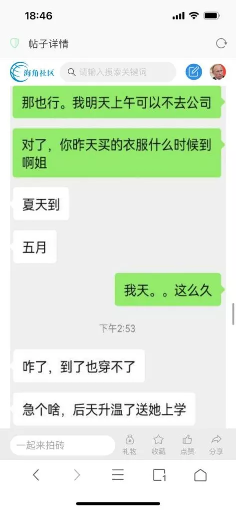 今天看电影也在犹豫要不要发一个视频。但也是我的锅,前几天晚上喝多了跟一个加我微信的海友打了微信电话,haijiaoshequ_456天南海北聊了快一个小时,脑子一热就答应了有机会再发一个帖。