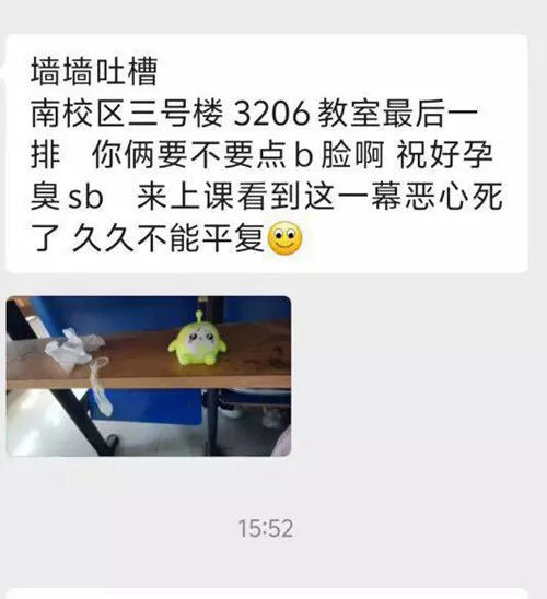 在石家庄学院南校区的三号楼3206教室,最近发现了一只使用过的避孕套,引发了一片哗然。原本应是知识和学术的场所,竟被用来掩盖一对学生情侣的私事。这对情侣不但在教室里野战,还直接将避孕套扔在现场,对学术场所的亵渎令人气愤。