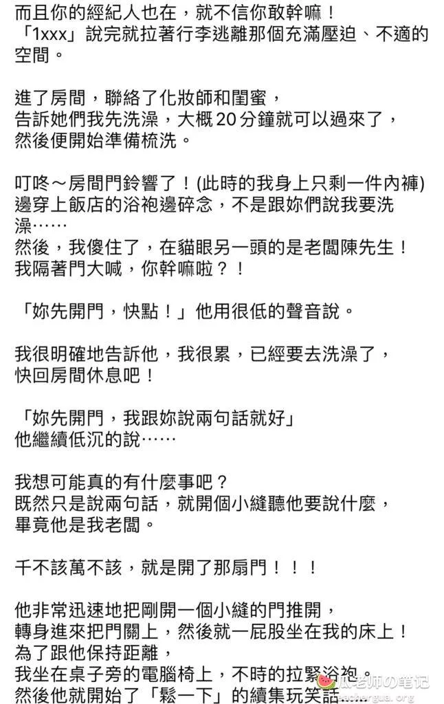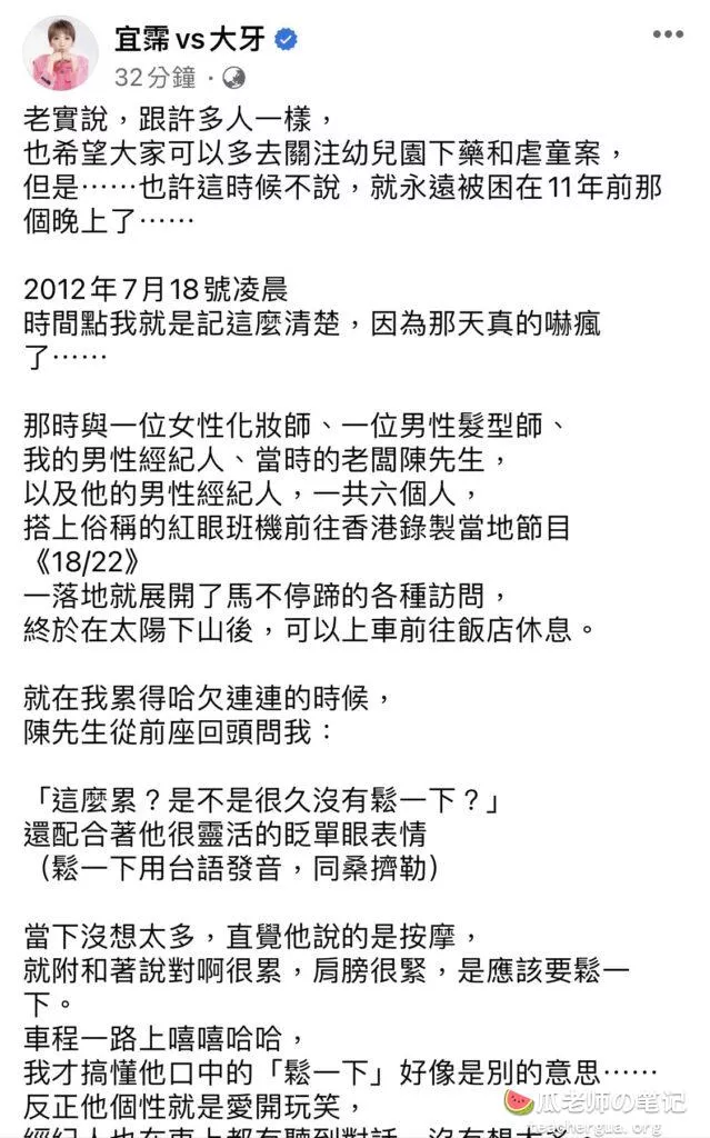 近日,大牙在社交媒体上发布了一篇长文,详细描述了自己曾遭陈建州性搔扰的经历。据她透露,2012年陈建州与她一同前往香港录制节目,在录制结束后,陈建州前去找她,并试图与她发生关系。大牙坚决拒绝并反抗,最终陈建州作罢。然而,这次事件给大牙留下了深深的阴影。