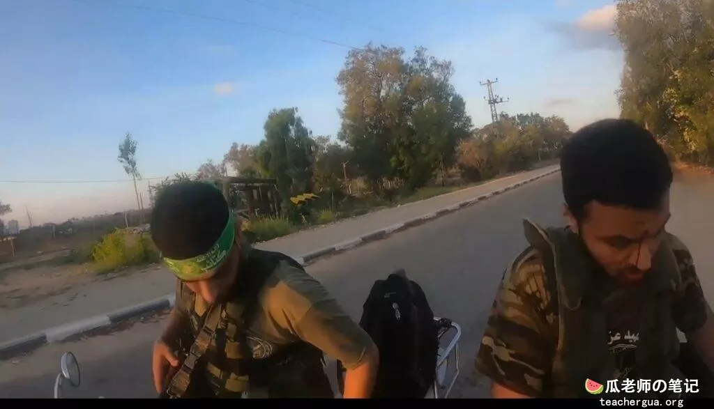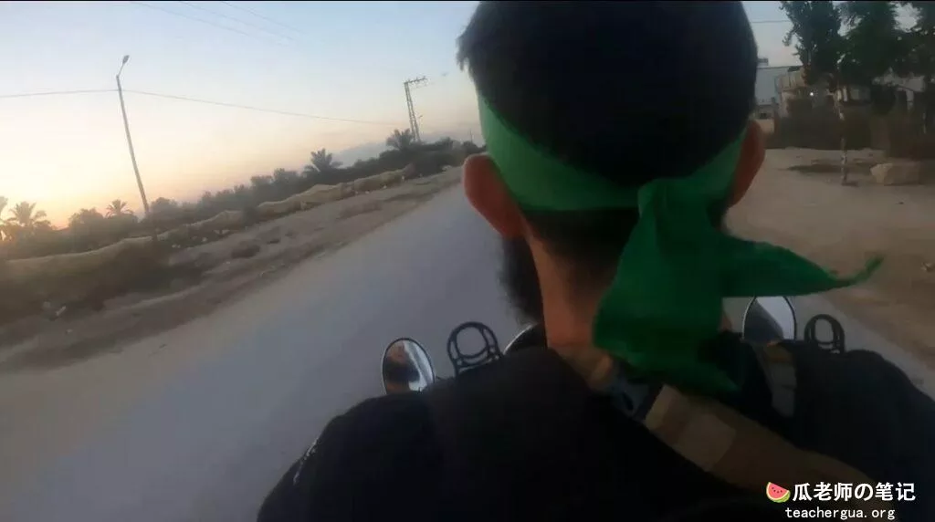在这段视频中,我们看到哈马斯恐怖分子骑着 GoPro,骑着摩托车穿过加沙街道,穿过哈马斯检查站,到达边境。