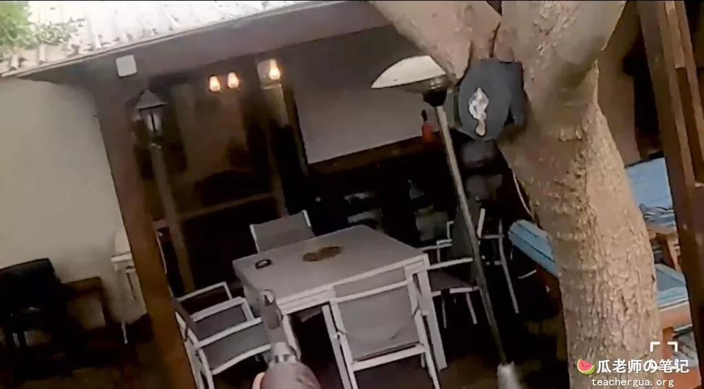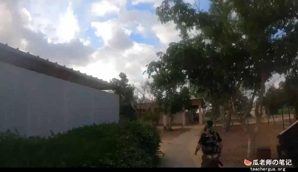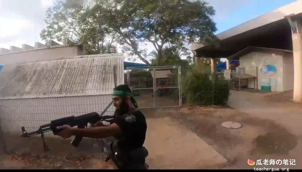 在这段视频中,我们可以看到,他们哈马斯一进入基布兹就开始向平民区猛烈射击。恐怖分子向一辆民用车辆开火(最初被阳光弄瞎了)。车内人员中枪后,继续驶出基布兹大门,直到撞上一棵树(恐怖分子停下来检查车内人员是否死亡)。