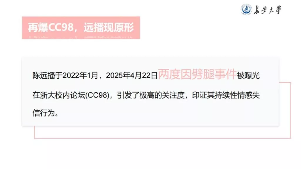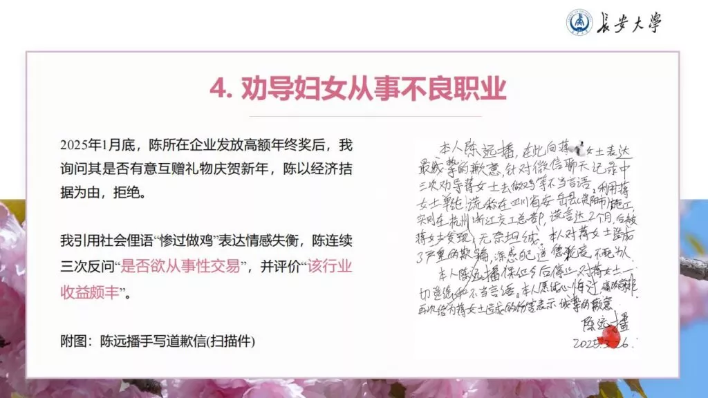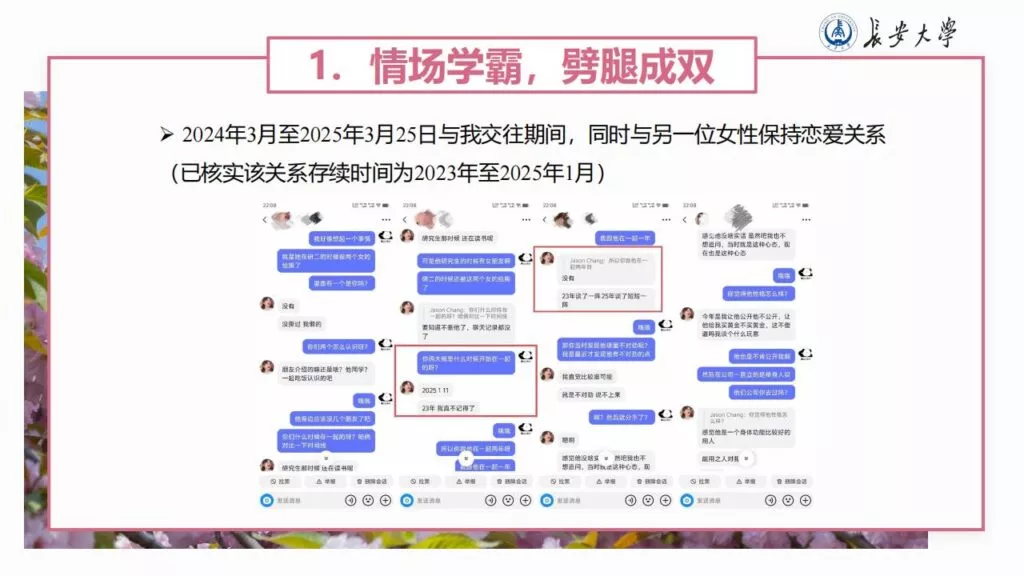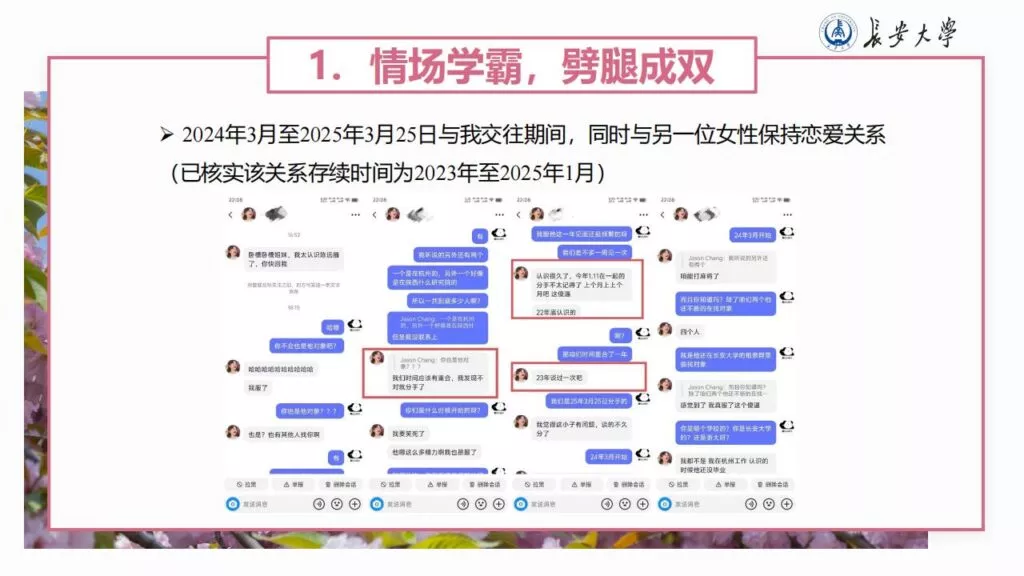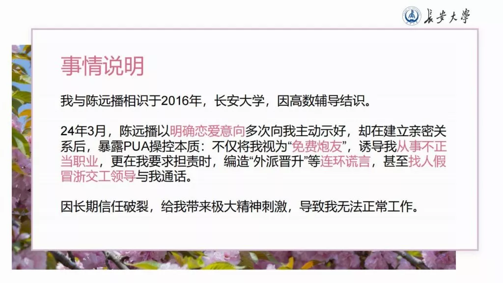 32页的PPT暴露了长安大学一名不道德男性陈远播的行为。他长期进行心理Cao控(PUA)女友,将女友视作免费的性伴侣,甚至劝告她去从事卖银。此外,他大部分时间都在物色新的猎物,或是在出轨的路上,或是已经出轨。